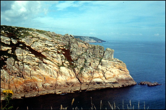 It’s hard to get a good feel for the sheer grandeur of the granite outcrops of southwest England simply by looking at a moorland tor. This view of the granite of Treen Cliff on Cribba Head near Porthcurno in the far west of Cornwall, however, shows the structure of joints really clearly. The picture was taken from the Logan Rock - a large, formerly rocking, stone eroded into a precarious, teetering balance until it was apparently toppled by a naval officer in the 19th century (if memory serves me).